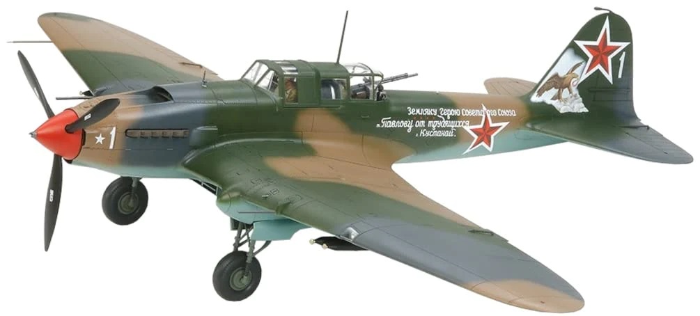 Ilyushin IL-2 Shturmovik si GAZ-67B 2buc 1:48 Tamiya 25212 este un kit macheta aeromodele ce include un avion de atac la sol si un vehicul militar, oferind un set complet pentru diorame realiste