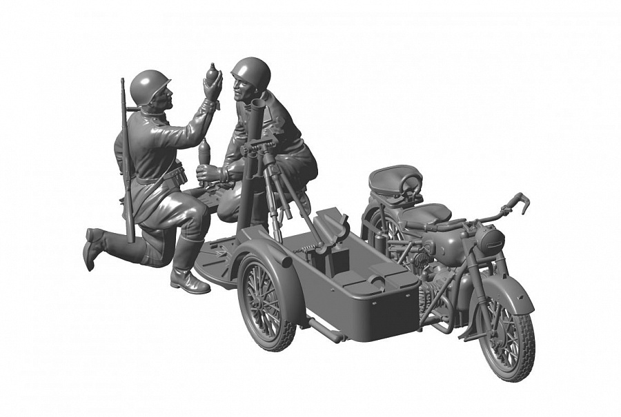 Soviet Motorcycle M-72 with 82mm Mortar 1:35 Zvezda 3651 este un kit macheta militara care reproduce motocicleta sovietica M-72 echipata cu mortar de 82 mm, utilizata pentru sprijin tactic in timpul celui de-Al Doilea Razboi Mondial
